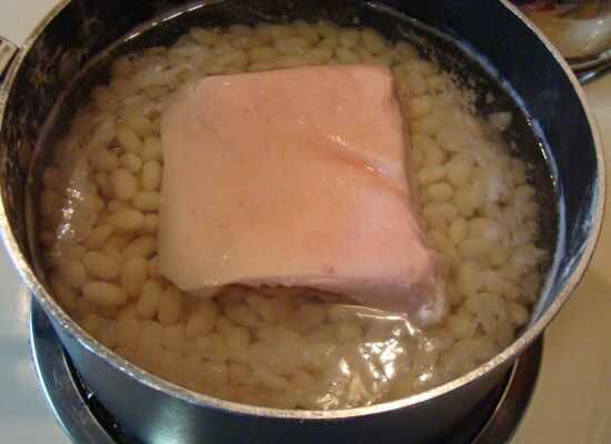 Añadir la losa de la grasa a los frijoles. Llevar a ebullición y dejar cocer durante unos 12 minutos.