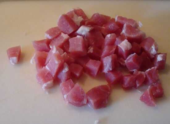 Mientras que los granos están hirviendo, cortar la carne de cerdo salada en cubitos de media pulgada.