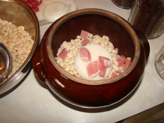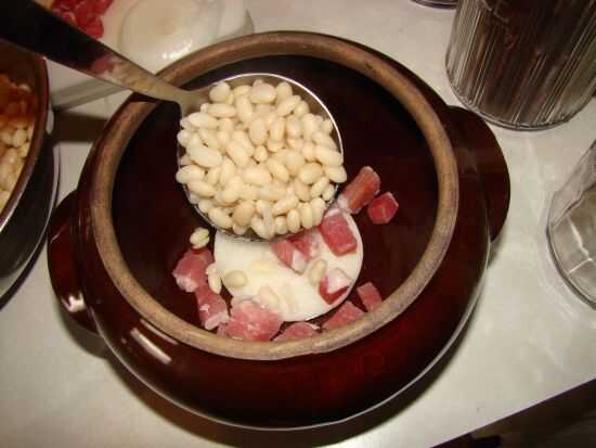 Añadir frijoles... Luego otra rebanada de la cebolla y la carne de cerdo salada. Sigue añadiendo estas capas hasta que todo se utiliza para arriba.
