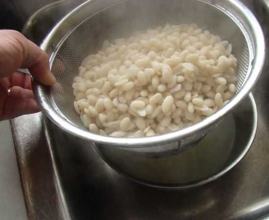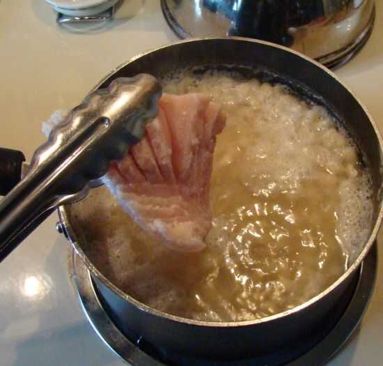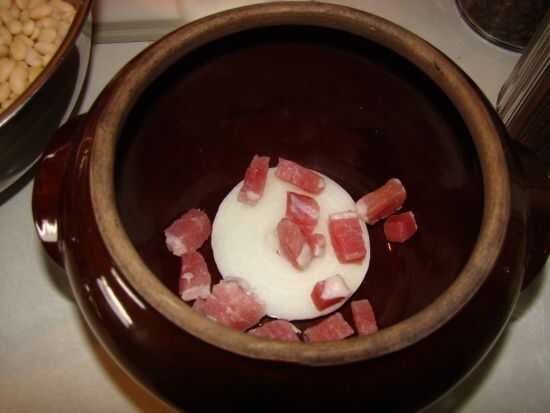 Mientras que el líquido esté hirviendo, colocar una rebanada de cebolla y uno de la carne de cerdo salada en el fondo de la olla de frijoles.