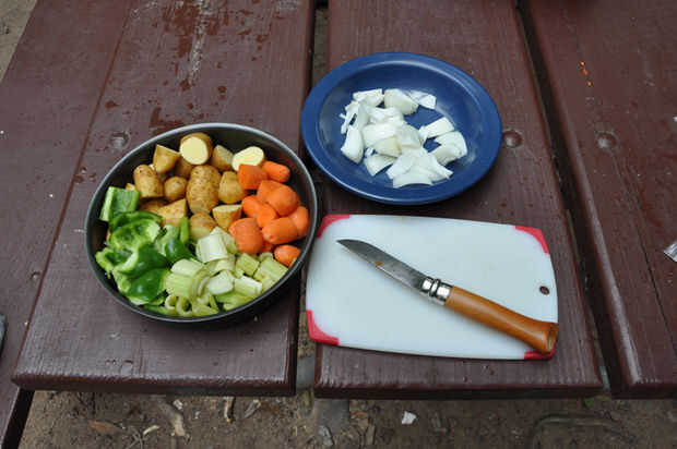 -Cuchillo, tabla para cortar, cuchara grande, sabes--el guiso habitual que implementa