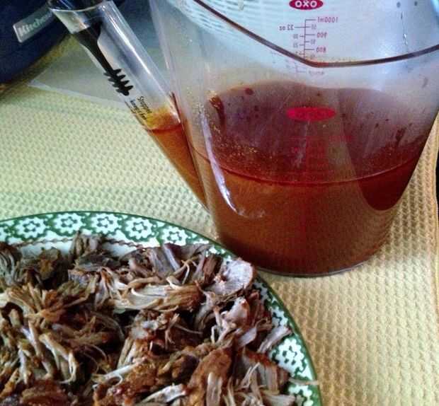 Cerdo transferencia al plato grande o tazón, deje que se enfríe un poco, luego desmenuzar en trozos de tamaño bocado, descartando cualquier grasa. Con la cuchara grande (utilizan un separador de grasa entonces transferido salsa a una cacerola pequeña), quitar la grasa exceso de superficie de salsa. Llevar la salsa a fuego lento sobre fuego medio-alto y cocine hasta que espese y medidas 2 tazas, 15 a 20 minutos. Condimentar con sal, pimienta y azúcar extra (Añadir sobre 1/4 taza de azúcar moreno ligero; nos gusta salsa barbacoa dulce), extra vinagre (agregar 1 cucharadita en el final de simmering para alegrar el sabor) al gusto.