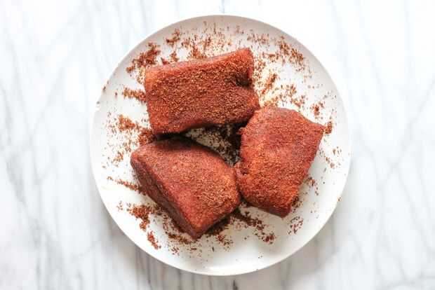 Cortar la carne de cerdo en tres partes iguales. Mezclar el sazonador de especias - use sus manos para romper para arriba todos los trozos de panela!