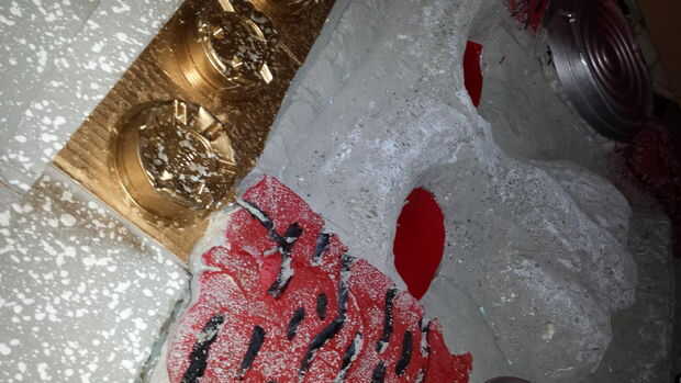 La cabeza del vestido tenía textura de papel de pared rociado a desbaste hasta el acabado de cartón liso y la mezcla. Discos redondos en el vestido de la cabeza y el área de "oído" son los trazadores de líneas plásticos que pones en macetas y sólo unos pocos centavos.