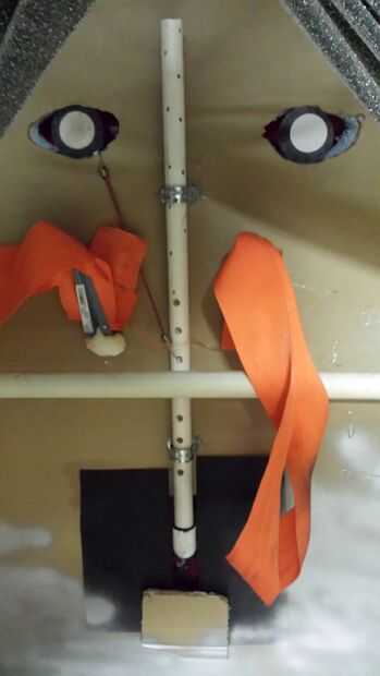 El mecanismo de movimiento de la boca se hace tomando una longitud del tubo de PVC, añadiendo una conexión de L y una pieza más corta afilada de PVC que está pegada en la pieza de boca en la parte posterior. Otra vez... Aplique el pegamento del gorila. Luego colocar dos de la C en forma de corchetes a la espalda del olmeca, ejecutar el tubo a través de y luego fije un bungie a uno de los agujeros en el tubo de PVC perforado para mantenerlo cerrado. Para abrir la boca, que simplemente tire hacia abajo en el tubo.