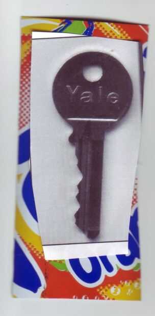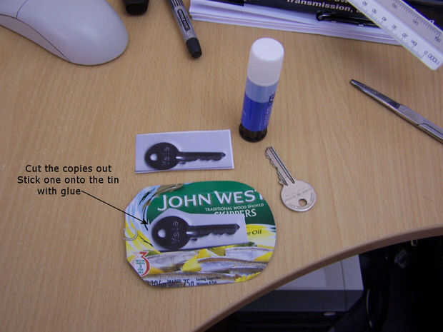 Tome un bebidas puede/lata y cortan un rectángulo lo suficientemente grande como para pegar la clave, o cualquier otro metal fino. He incluido la foto de mi copia de la misma clave en una lata de bebidas y una lata de pescado!