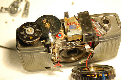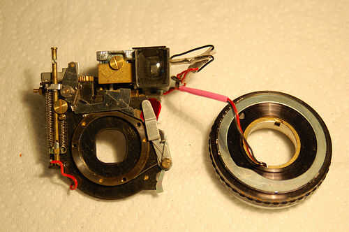 Lo de las tripas: aún trabajan. Si el sensor es hacia arriba (es decir, en luz) todavía puede accionar el obturador. Excepto en este caso, el obturador no cerraría, y yo no podía avanzar el mecanismo. Todavía desconcertado.
