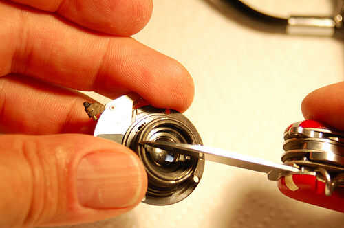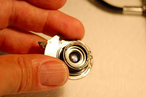 Ahora, otro anillo, con dos ranuras. Mis uñas no fueron lo suficientemente fuertes, así que necesitaba algo recto, rígido y fino para cubrir el diámetro y girar el anillo. Realmente no uso mi cuchillo. Usé un set de tijeras. Manchado la superficie del anillo bastante mal. Argh. Pero el anillo se salió.
