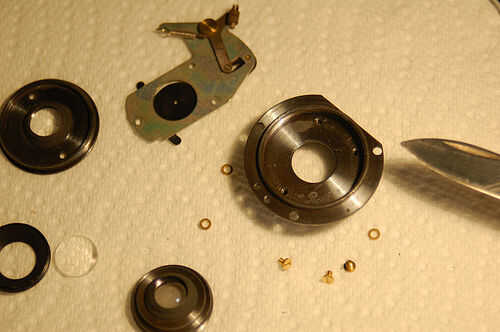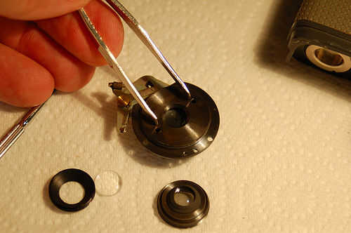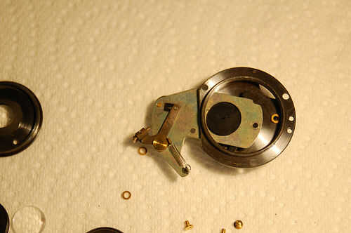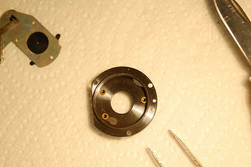 Ahora hay una placa semi rectangular, sostenida por tres latón (muy suave metal) tornillos. Mucho cuidado al saque. Debajo de la placa, debajo de cada tornillo, es una lavadora. Cuando vuelva a montar, tienes Deslice cada arandela bajo como usted vuelva a colocar cada tornillo. No es demasiado difícil.