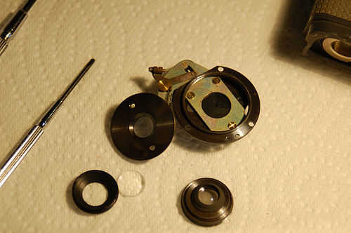 Limpia como lo haría cualquier hojas delicadas obturador--sin tocarlas, con empañarlo paño y disolvente (lighterfluid es común, pero en otras cámaras que he usado vodka--hay beneficio evidente a partir de una botella de vodka ganadora por frente a una botella de líquido para encendedor [altamente inflamable]).