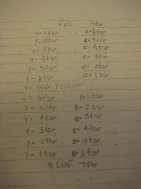 Las matemáticas: como se puede ver, iniciamos con siete cucharaditas de colorante total para cada cambio. Si usted cuenta el número de espacios hay siete espacios contando uno de los dos colores puros. (Si usted está haciendo algo más grande, digamos un mantel o un vestido de fiesta, puede empezar con el doble de esa cantidad). Nos numeran nuestro papel de 7 cucharaditas 1 cucharadita a partir de cada color puro y va hacia el segundo color. Eso significa que el color del centro tuvo que descender desde el centro hacia arriba y el centro. Por favor leer atentamente la última foto ya que muestra el método completo. Si eres astuto, verá que sólo conté 15 secciones para esta matemática. La razón es que el amarillo es un color difícil para mantener pura, así que hemos asignado dos secciones para el amarillo. Es puramente de la experiencia.