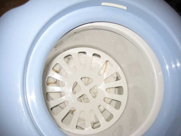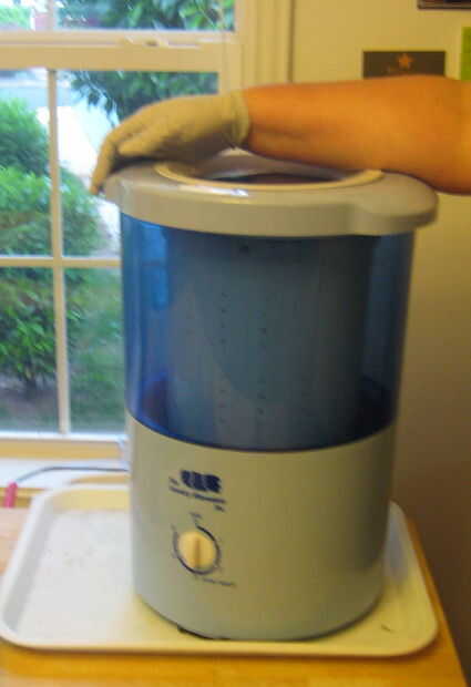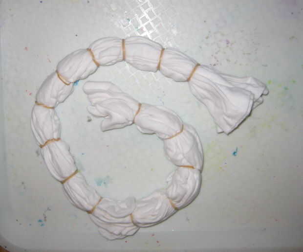 De la vuelta. Si no tienes un spinner, o darle un giro en la lavadora si el ciclo de centrifugado no añadir agua o enrolle en una toalla y exprimir el exceso de agua de la camisa. Me gusta teñir mis camisas bastante seco. Usted puede teñir una camisa más mojada, pero no tienes como saturación de tinte buena como el agua en la camisa diluye los tintes un poco.