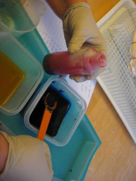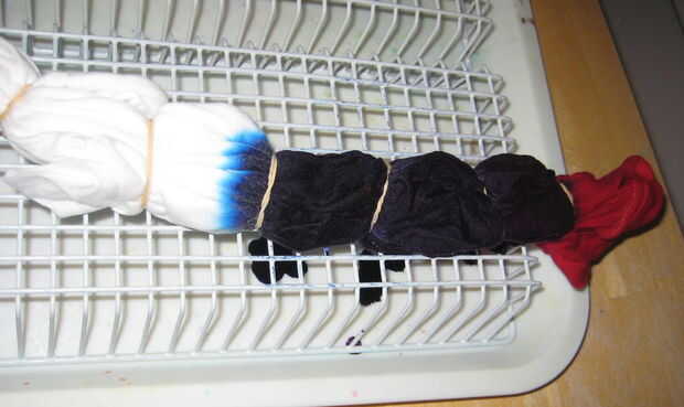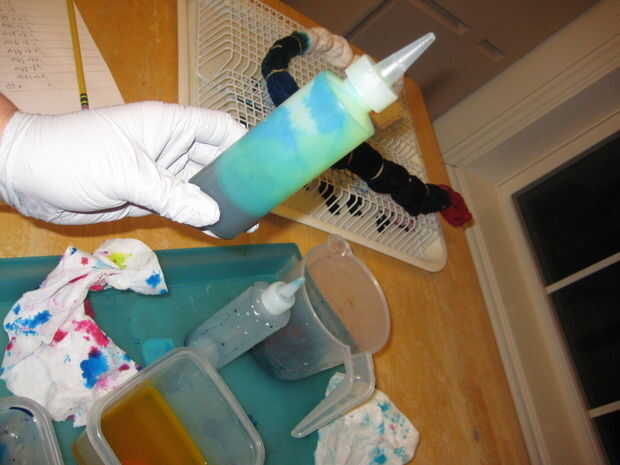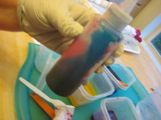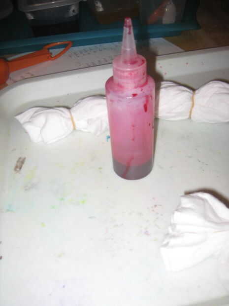 - Descarga extra tinte de botella en un contenedor de basura *. Voy a usar este tinte en otros proyectos así que intento tener un contenedor de residuos para el verde y un contenedor de residuos para el púrpura.