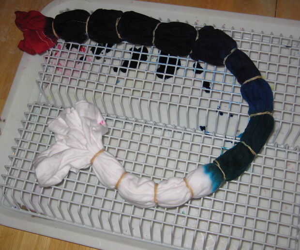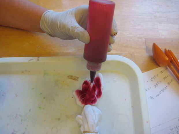 - Teñir cada sección entre bandas de goma, asegurándose de que no hay ningún blanco en la sección. Significa comprobar dentro de los pliegues o recoge cuidadosamente.