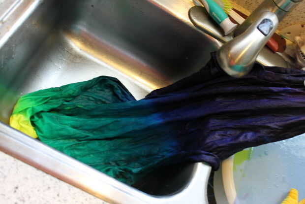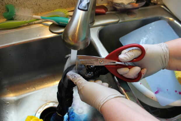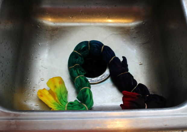 Sólo una nota, como se puede ver, guardo el amarillo fuera el enjuague agua hasta que salga bastante limpio. No estoy realmente preocupado por la contaminación cruzada ya que el tinte se desactiva, pero todavía tengo cuidado para la primera parte de enjuague.