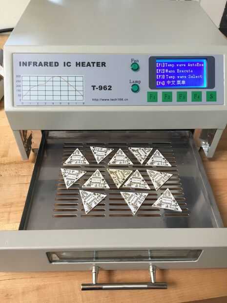 Flujo-soldar los cristales SMD que no eran fáciles de soldadura de mano con el nuevo horno de reflujo en el muelle 9. Mano-soldar todos los componentes: porque no tengo una galería de símbolos de soldadura buena esto era simplemente tan rápido.