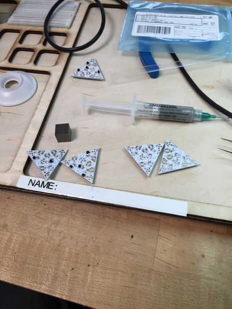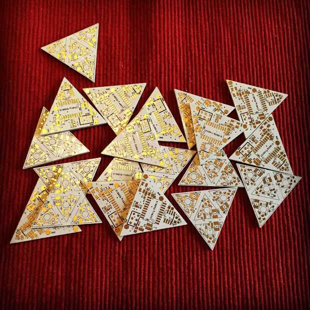 Una vez que el circuito fue diseñado y probado, podría pasar a producción. Porque el interior del globo óptico es un icosaedro con 20 caras, necesito PCB total 19 (la parte inferior del icosaedro se sacrifica para el pilar de montaje). Tuve 20 hecho en caso de que necesitaba un repuesto. Tenía hechos en el extranjero con soldermask blanco: estaban muy baratas, pero tomó más de un mes en llegar debido a las demoras aduaneras.