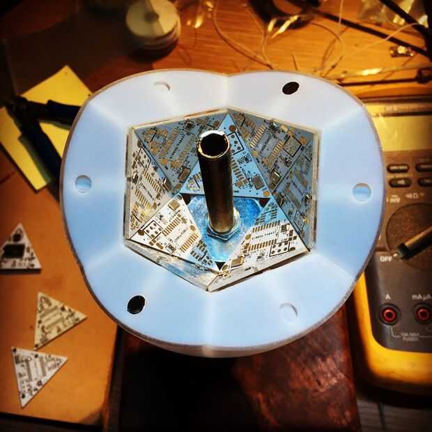 Una vez individualmente fabricados y probados, llegó el momento de los PCB del alambre juntos. EachPCB tiene seis conexiones: Alimentación 5V, masa, llevó datos en datos del LED hacia fuera, y dos cables de los datos diferenciales en serie RS-485. Las líneas de datos del LED están encadenada: cada PCB está conectado con sus vecinos por aguas arriba y aguas abajo. Todas las conexiones son buses que cada tablero está conectado a los mismos cuatro cables. Para ayudar a conectar los buses, hice un tablero de autobús de protoboard que se acopla a la varilla roscada. Esto también tiene enchufes para conectar los conectores de la parte superior del globo.