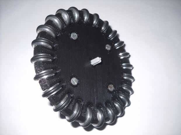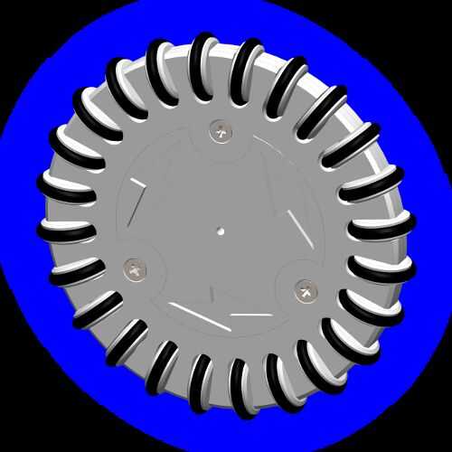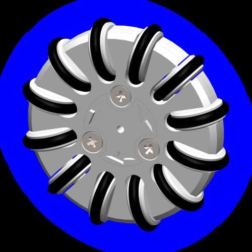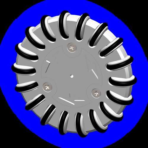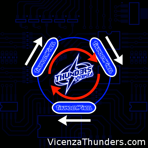 Exactamente como en la situación anterior, usando un robot de tres ruedas omnidireccionales colocados como en el gráfico a la derecha, y gestión de la velocidad de rotación de cada uno de ellos, podemos hacer que el robot mueva en cualquier dirección. La mayoría de las consideraciones que hicimos en la descripción de la caja con cuatro ruedas es igual en este caso, las diferencias principales son que con tres ruedas la velocidad máxima es más baja y la dificultad de gestionar los movimientos es mayor. Sin embargo, con una rueda menos así que un motor en menos también, el robot es más ligero y esto puede ser útil en situaciones donde el peso es un factor importante. La imagen animada muestra los movimientos básicos que se obtienen mediante la combinación de la velocidad y la dirección de la rotación de las ruedas especiales. Presta la atención que en los casos de desplazamiento a la derecha y a la izquierda las flechas son más pequeñas, esto indica que hacer estos movimiento la velocidad de las ruedas debe ser 50% de la rueda del lado opuesto; Esto porque, como se mencionó antes, para hacer que el robot hace un movimiento rectilíneo es necesario que la suma del momento producido por las ruedas es cero. Este es nuestro #ThunderOmnibot que utiliza tres de estos discos: ver el video.