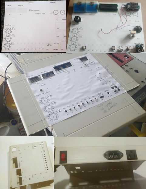 Reutilizar la hoja de plástico superior de una tableta grande de Summgraphics antiguo como base para la placa. Pega la plantilla de papel para esto y cortar como muchos de los agujeros con una dremel. Luego doblar los bordes de la lámina de plástico después de calentarlo con una pistola de aire caliente. Algunos más corte de orificios de los interruptores y enchufes de CA IEC seguidos insertando en el panel de plástico.