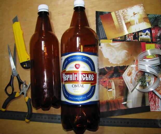PET vacías botellas de 2l, 1l, tijeras, cuchilla, alicates, regla, materiales decorativos y accesorios (su elección), por ejemplo la página de la revista, impresión de imagen de ordenador.
