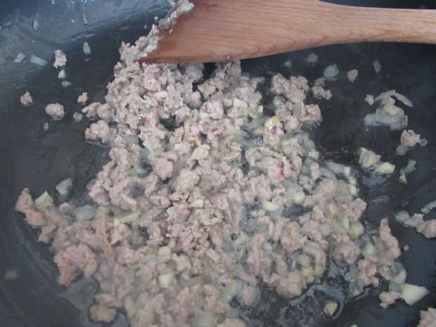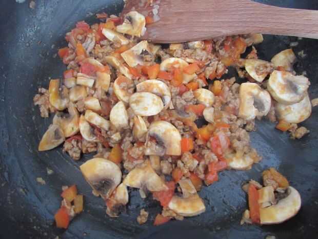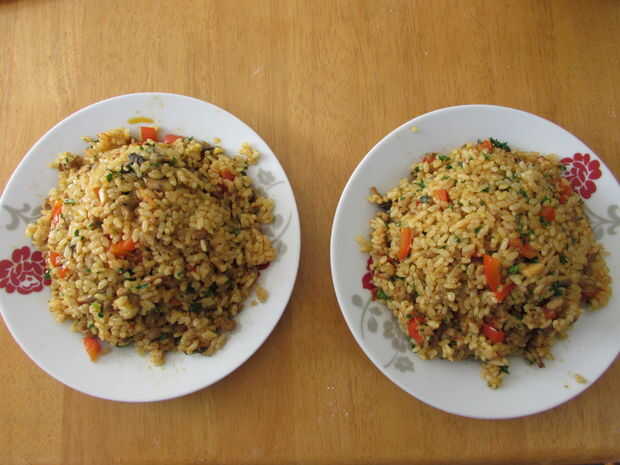 Utilizando la misma sartén, añadir una cucharada de aceite y sofría el ajo y la cebolla durante 2 minutos, luego poner la carne de cerdo picada y deje este marrón. Añadir la pasta de tomate y rehogar durante 2 minutos. Luego añadir el pimiento picado, tomate y champiñones en rodajas y rehogar durante 5 minutos. Poner el curry en polvo, mermelada y la sal y dejar cocer durante 2 minutos. Añadir el arroz y bien mezclar los ingredientes y revuelva freír hasta que el arroz tiene un color amarillo uniforme. Puede agregar más sal si es necesario en este punto. Luego el arroz en dos platos la porción y dejar de lado.