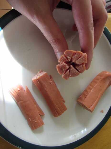 Preparar los ingredientes picar el ajo y el perejil, picar la cebolla, pimiento y un tomate. Cortar las setas y el otro tomate, este último se utilizará para decorar. Cortar las salchichas en tercios. Ambos extremos y 4 cortes en la parte del extremo cortado para hacer el pulpo. Cortar longitudinalmente la parte media de la pizza y hacer 4 cortes en ambos extremos para hacer el cangrejo. (Foto 2)