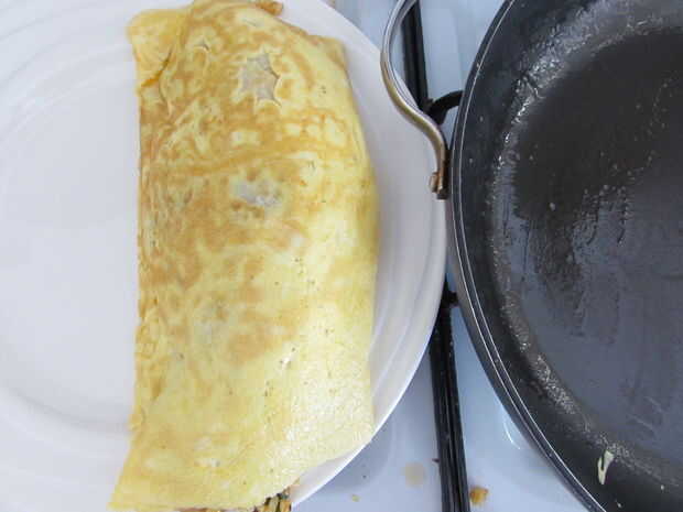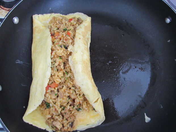 Para hacer una tortilla, batir 2 huevos en un bol y poner una pizca de sal y pimienta. A fuego moderado, vierta 2 cucharadas de aceite y difunda en la superficie de la olla. Verter los huevos y repartir uniformemente inclinando la sartén. Cuando el huevo está cocido, apagar el fuego y poner una porción de arroz frito en el centro del huevo. Levante ambos extremos de la tortilla de huevo hacia el arroz y la tortilla entera en un extremo del pan. Tiene una placa de ese lado e incline la bandeja encima de la placa. (Foto 3)