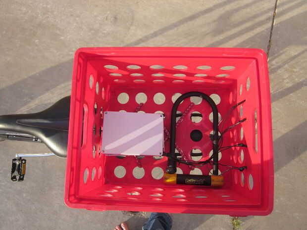Cuando empecé este proyecto, ya tenía un cesto atado a mi bici. Si no, es bastante fácil de hacer. Las tres cosas que utilicé fueron: bike rack, cesta super barata, alambre con gancho (olvidó cómo se llama, pero es bastante fácil de encontrar).
