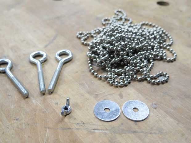 Después de que has quitado tu árbol, reemplazarlo con un gancho de ojo y una arandela roscada a través de cada lado. Tornillo en una tuerca de mariposa en el extremo para asegurarse de que todo encaja y se asegura. Vas a tener que deshacer el montaje para fijarlo a los soportes, pero es bueno comprobar que todo funciona.