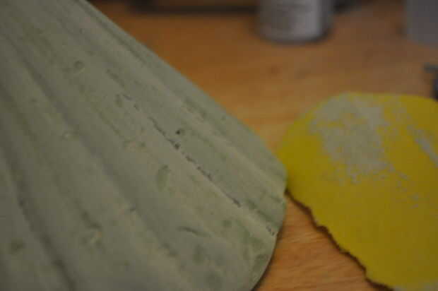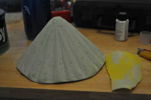Fue el siguiente paso en el proceso crear la forma correcta en la parte exterior del cono de fibra de vidrio. Para hacer que mi patrón deseado para que se vea como una concha usé llenador del cuerpo del coche. Mezclado el relleno y el endurecedor (viene como un conjunto de Halfords). También utilicé un truco que había visto en línea que es mezclar alguna resina de fibra de vidrio, esto hace que el relleno una mejor consistencia para trabajar con y es más fácil crear la textura de la cáscara que quería. He utilizado la tarjeta para aplicar el relleno y se sugieren guantes para este proceso ya que puede hacer bastante desordenado. El relleno se llevó mucho más tiempo en secarse que en la prueba que hice antes pero sólo puedo suponer esto fue porque era más frío y había mezclado en menos endurecedor. Una vez que el relleno esté completamente seco pasé bastante tiempo lijado hacia fuera todos los bits de relleno que no quería. Usted puede hacer cualquier forma que desee y que sería divertido experimentar con diferentes formas. Por ahora la shell debe ser muy fuerte y si es como el mío lucharían para romperlo!