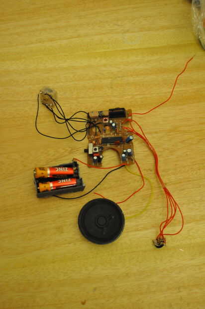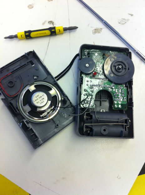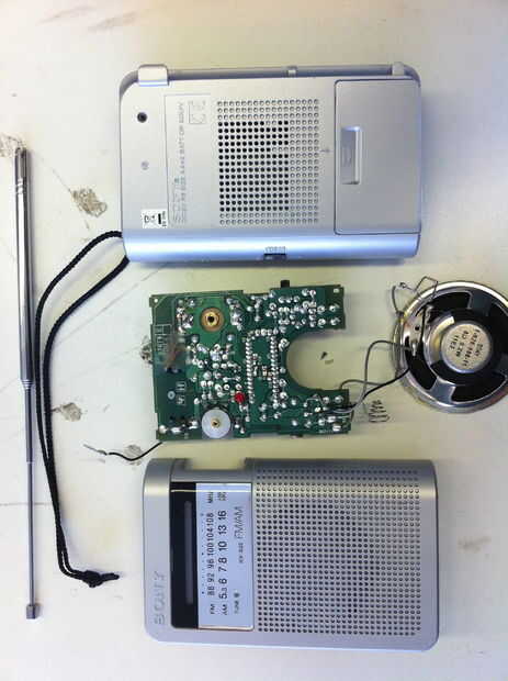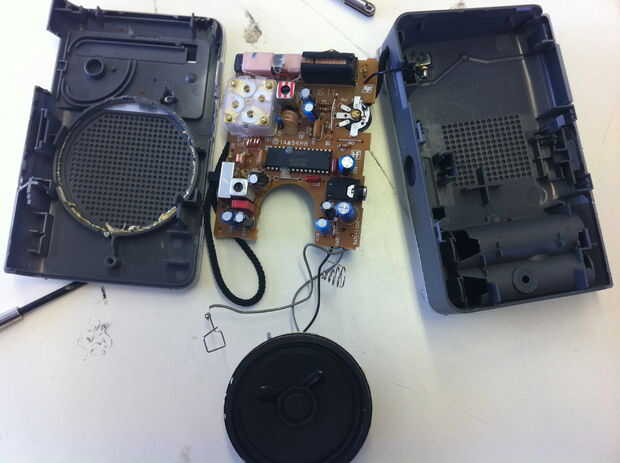 comencé por dimanteling la radio que habíamos tenido. Había sólo unos tornillos para sacar la carcasa a la placa de circuito. Es un simple FM / AM radio de Amazon y hay un enlace de más abajo. Para mi radio que descarté el exterior de la carcasa (aparte del soporte de pilas que picado hacia abajo tan pequeño como sea posible) y sólo mantuvo el jabalí del circuito y el altavoz. Tomé el control de volumen y el control de sintonía del tablero de circuito y vuelva a los cableados con cables más largos. Esto me dará espacio para poner estos controles en diferentes lugares.