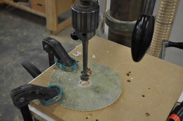 Corte el disco en un círculo perfecto con la Sierra de prohibición y una lijadora de disco. Yo había hecho una plantilla de papel para ver qué tamaño de disco necesitará todavía ser capaz de encajar en mi electrónica. Luego tuve que ajustar el émbolo en la parte inferior del disco. He comprado este émbolo de B & Q para £3. Tiene una rosca en la base que hace ideal. Perforé un conjunto suficientemente grande para que el hilo caber a través así que podía enroscar el émbolo desde el otro lado y sería emparedado el disco de fibra de vidrio. Luego cortar el exceso mango y le dio un rápido arena de pulcritud.