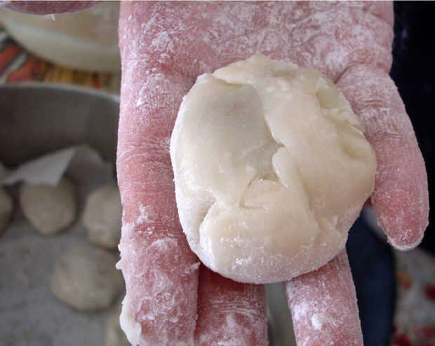 Normalmente estaría utilizando guantes y sigo trabajando en la comprobación de si la harina de arroz está cocinada bien antes de lanzar a las bolas.