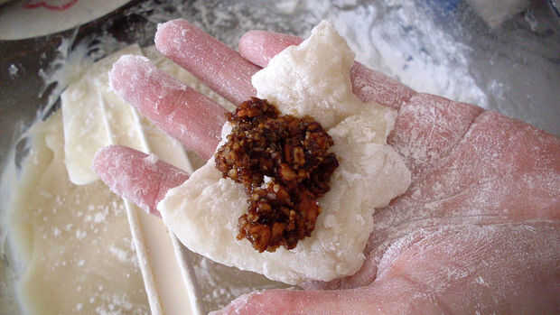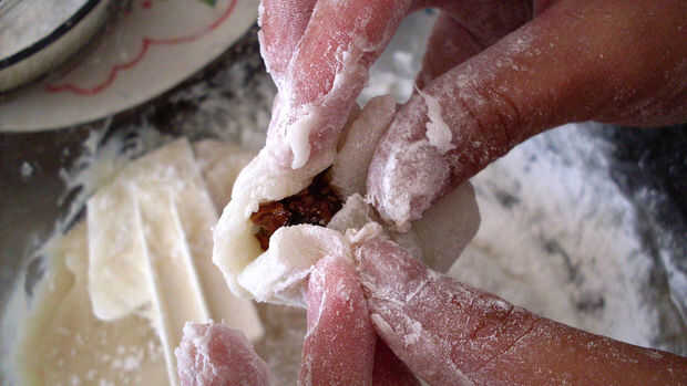 Las manos de capa con almidón crudo de maíz (o harina de arroz glutinoso frito) e introducir el relleno.