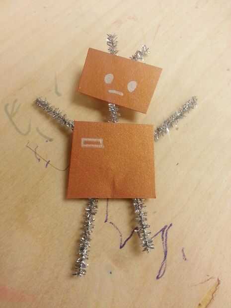 Hacer tu robot (u otra cosa) que meneo y tambalearse cuando termines. Asegúrese de que termina alrededor del tamaño de una tarjeta 3 x 5 Nota. (Utilizamos cartulina metálica, sharpies metálicos y plata limpiapipas.