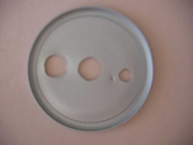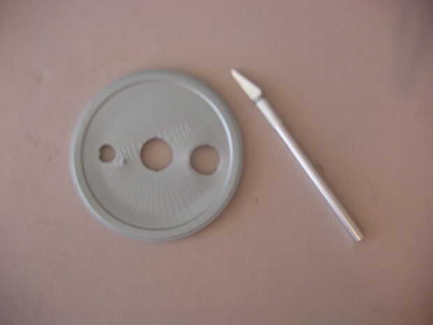 Una vez que hayas limpiado el contenedor sacar la tapa y corte tres agujeros. En el centro es para el motor DC. El agujero más grande (derecha) es para el interruptor de eje de balancín. Te cortan un agujero pequeño para el reostato. Asegúrese de que obtener una raja pequeña en la tapa para garantizar ese reóstato.