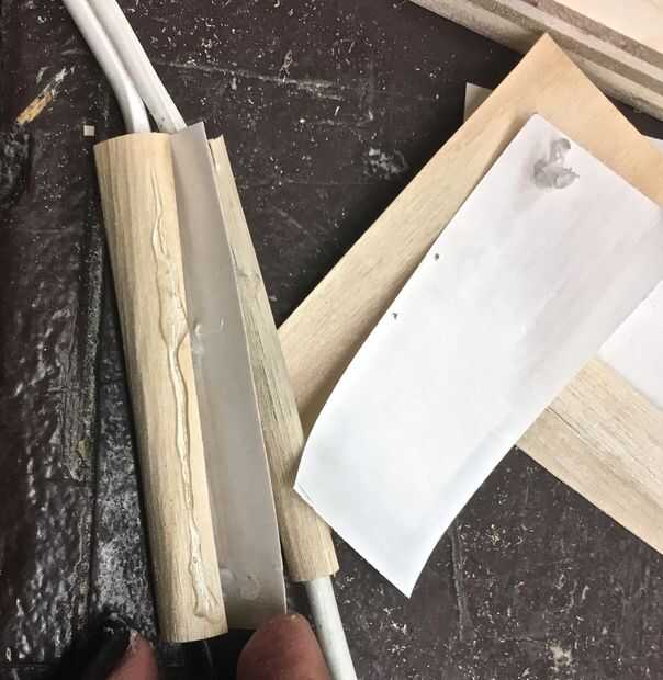 • Este paso es opcional. Como no quería que la conexión se nota desde fuera, que quería cubrir la región de la médula que ha grabado con una portada que hice usando cinta y bard madera. Cortar un trozo rectangular de madera de barc que será suficiente para cubrir la región con cinta aislante. La bobina de la madera de barc alrededor de esa región. Usando pegamento de cola caliente la madera barc a una forma de cilindro que cubre la zona con cinta. Tenga cuidado de no poner mucho pegamento para que no perjudique el aislamiento de goma. Como pegamento caliente puede dejar manchas en la madera, utilice cinta aislante o cualquier cinta adhesiva que es pegajoso, para cubrir el borde conectado con las manchas de pegamento caliente.