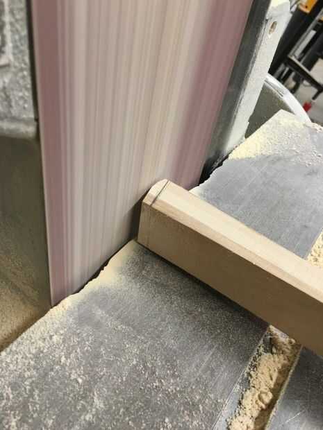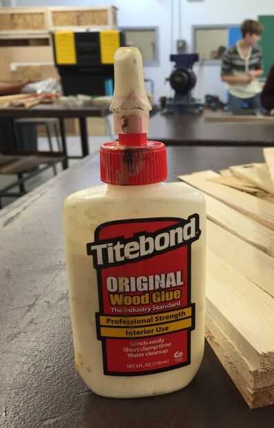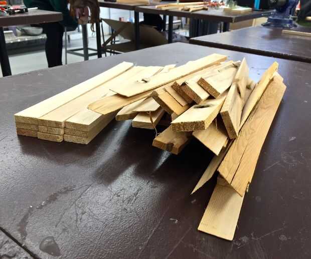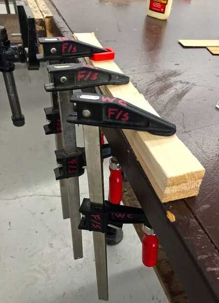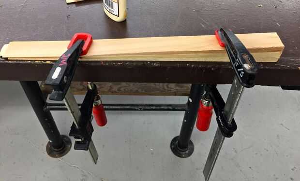 • Pegue tres capas de cuñas de madera uno sobre otro cubriendo su superficie con pegamento de madera y los amarre juntos.