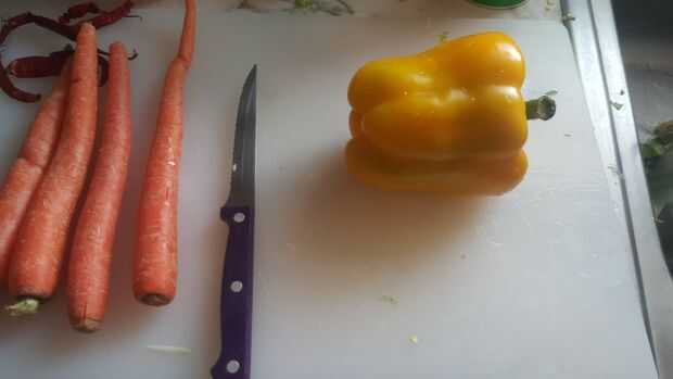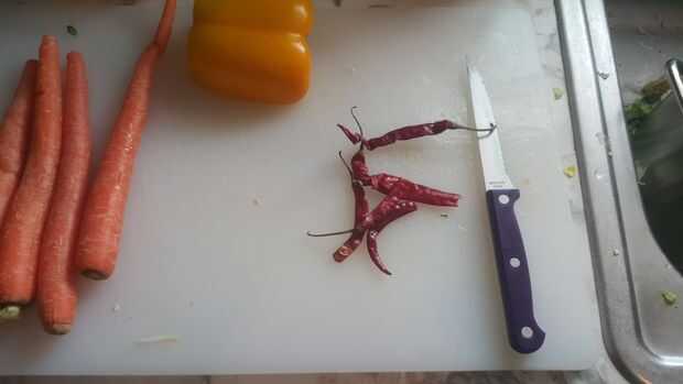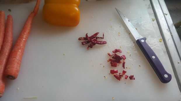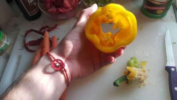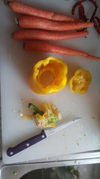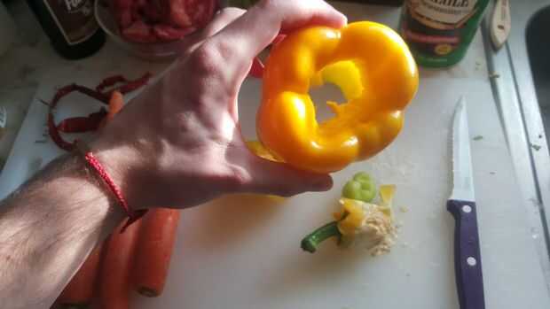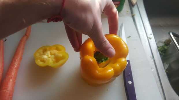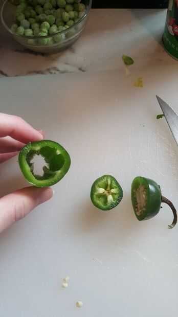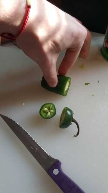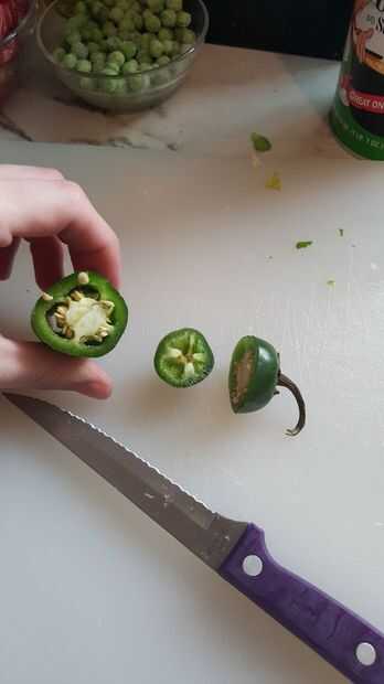 Aquí está un truco genial si siempre tienes problemas para conseguir las semillas de sus pimientos o jalapeños... y que en todas partes. Esta forma de corte parece menos del producto así como de residuos, y no acabar chorros de jugo de pimiento o semillas en tu ojo... como cuando probé con una cuchara una vez.