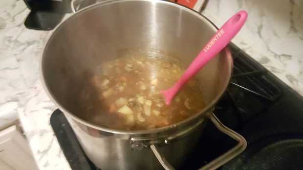 Para comprobar el guiso unos 45 minutos en comer una patata y una zanahoria. Si ambos son suaves a través de todo el camino, entonces usted está finalmente listo para comer! Que mina servida en un tazón y disfrutar con una copa de tinto Apothic. También fue una noche de tarea para mí.