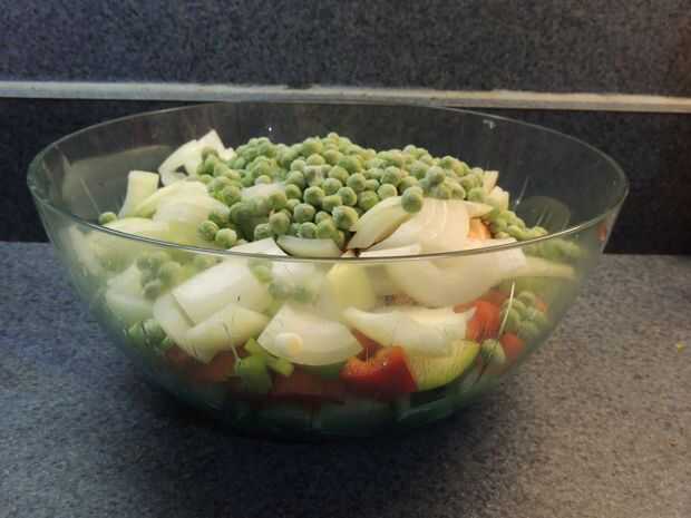 Picar la vegi en trozos pequeños y lanzarlos en un tazón grande para más tarde.
