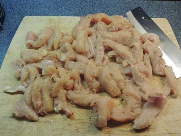 Copa el pollo en tiras pequeñas, estilo fajita. Si lo prefiere, usted puede cubo. Se trata de preferencia. Sazonar con un espolvoreo de sal, pimienta y jengibre.