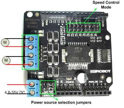 El protector del Motor puede ser alimentado directamente de Arduino o de fuente de alimentación externa. Se recomienda utilizar alimentación externa para poder el escudo del motor.
