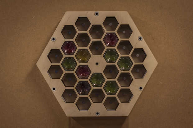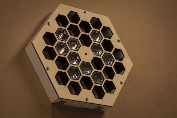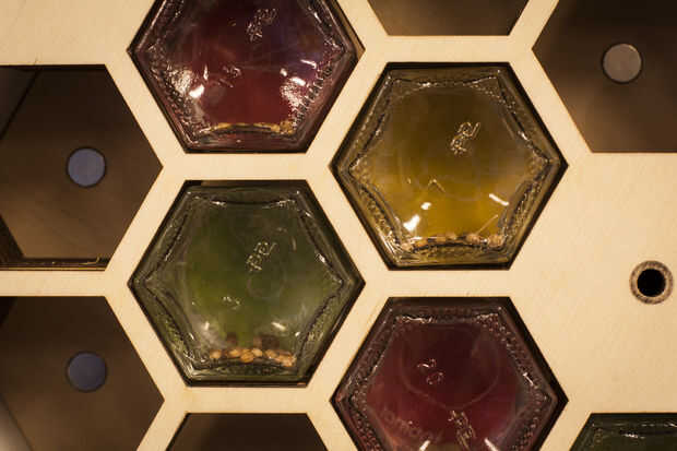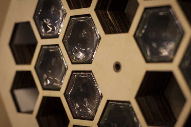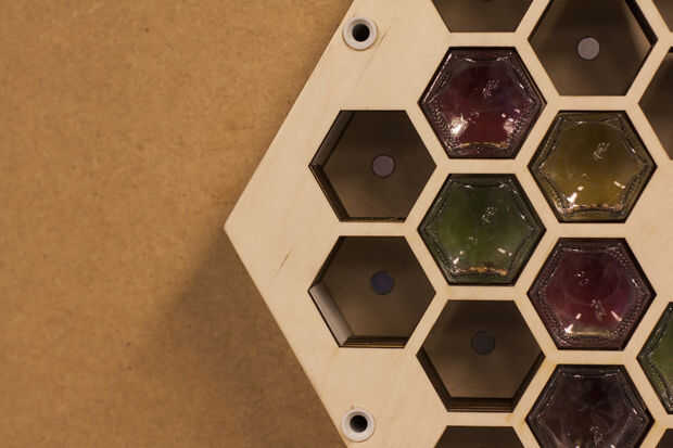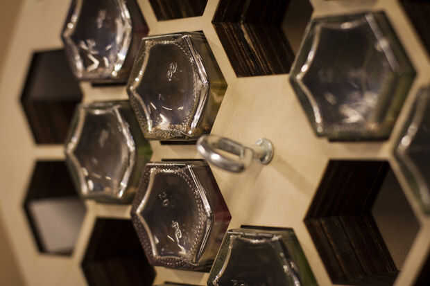 Basado en un panal de abejas y sus formas hexagonales creamos un producto de aspecto amable y natural que puede montarse en la pared. No hay sistemas de cierre convencionales se utilizan para disuadir el vandalismo. Los frascos se pueden acceder mediante una clave simple: un perno.