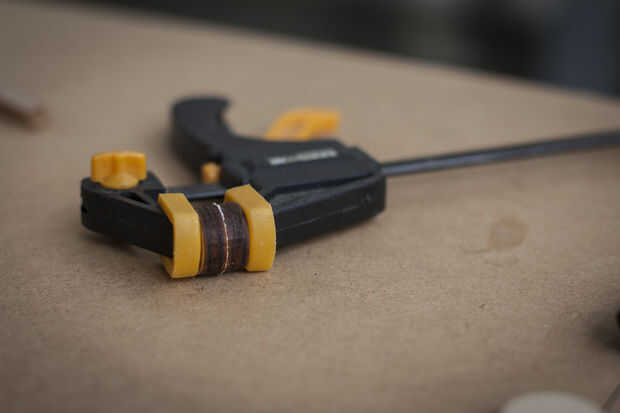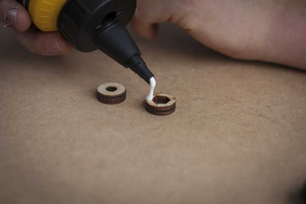En el lado del producto que tiene una tuerca para fijar en la parte trasera, para nosotros primero crear un bloqueo de tuerca donde se ajusta la tuerca en. Estas dos partes poco forman parte del panel de lasercutted 'Interior placa Extra'.