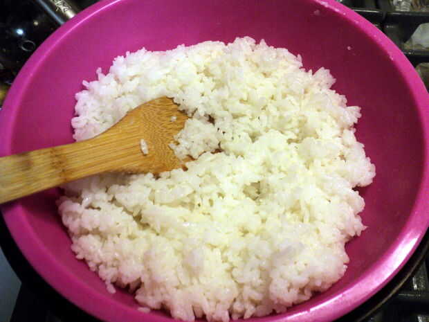 Utilice una cuchara de madera o el arroz para mezclarlo todo y activar el arroz para que se enfríe más rápido.