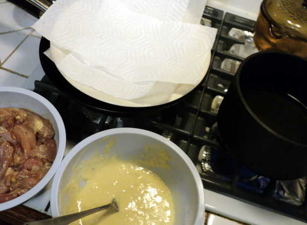 Cubra todas las piezas de pollo por sumergir en la mezcla y luego en la freidora.