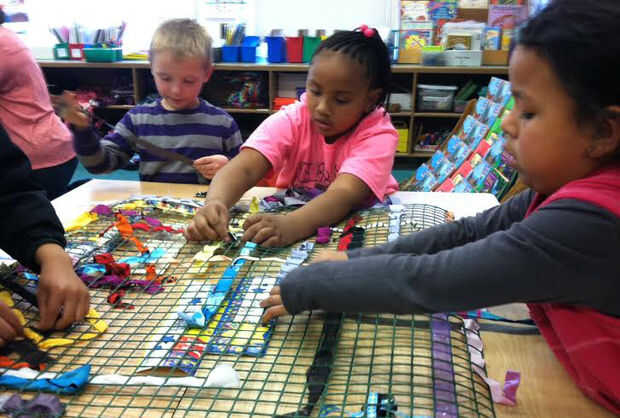 Mostrar los estudiantes que tejer exitosa es simplemente creando un patrón... sobre, debajo, encima, bajo. Las tiras de tela será más seguras si tejen dentro y fuera de plazas solo de la malla. Si se salta sobre plazas, entonces puede no crear suficiente tensión en la tela para sostenerlo en lugar. La paciencia es la clave. Trabajo en cooperación con otros - a veces tus franjas de tela conoceremos y Cruz. A veces un estudiante sentado en la mesa puede terminar tejer algo que no puede llegar. Recuerde a los alumnos que el objetivo es trabajar juntos para toda la hoja del acoplamiento de la armadura.