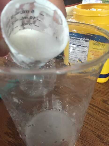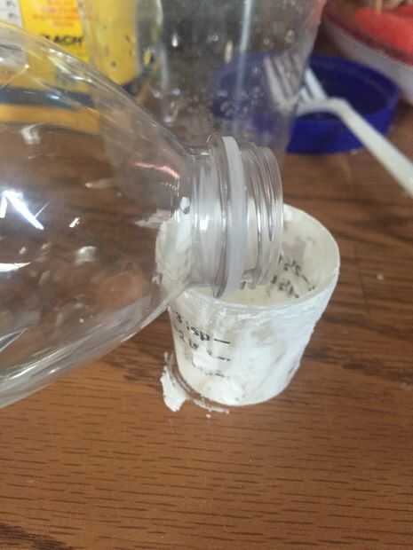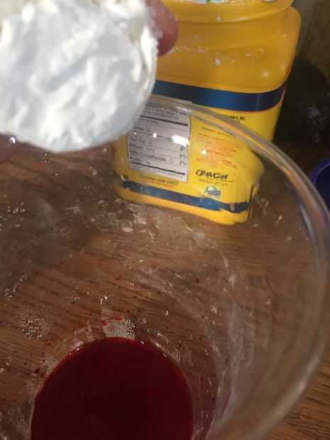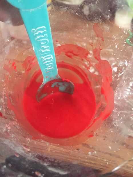 Así que primero se mezcla el agua con el tinte. Luego se agrega el almidón de maíz y empezar removiendo con una cuchara. Revuelve hasta que hay no más grumos de almidón de maíz.